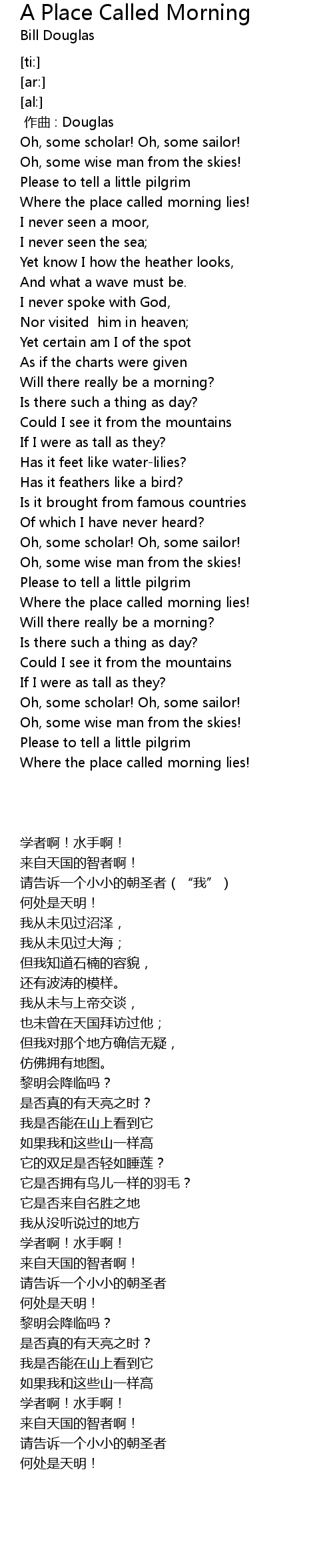 | [00:21.42] | Where the place called morning lies! |