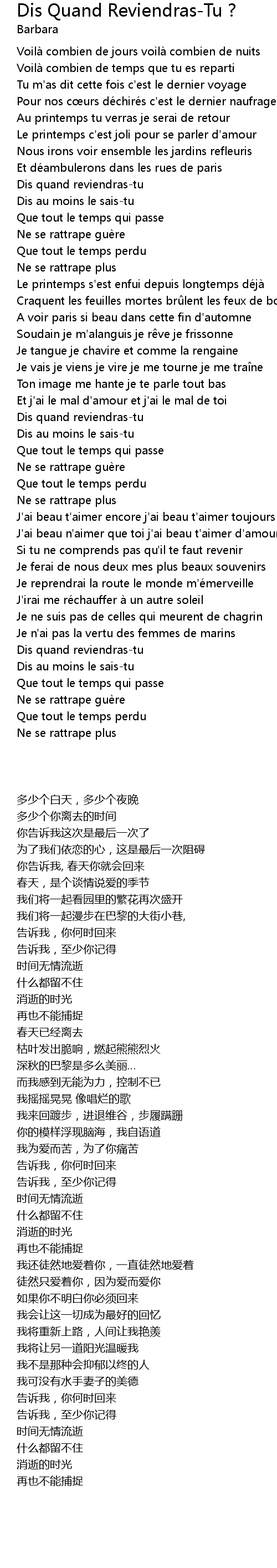| [00:19.29] | Au printemps tu verras je serai de retour |