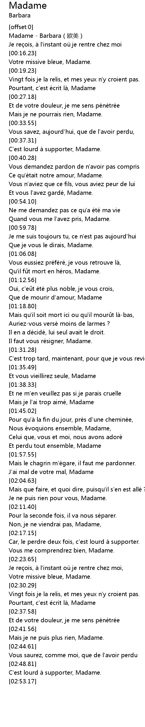 | [02:01.67] | J' ai mal de votre mal, Madame |