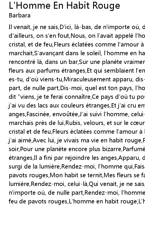 | Il venait, je ne sais, D' ici, la bas, de n' importe ou, de nulle part, Et d' ailleurs, on s' en fout, Nous, on l' avait appele l' homme en habit rouge, De cristal, et de feu, Fleurs e clate es comme l' amour a la lumie re, Fabuleux, il marchait, S' avan ant dans le soleil, l' homme en habit rouge, Je l' avais rencontre la, dans un bar, Sur une plane te vraiment bizarre, Il fumait des fleurs aux parfums e tranges, Et qui semblaient l' envoyer jusqu' aux anges, Qui estu, d' ou vienstu, Miraculeusement apparu, dismoi, dismoi, dismoi, D' autre part, de nulle part, Dismoi, quel est ton pays, l' homme en habit rouge, Il m' a dit " viens, je te ferai conna tre, Ce pays d' ou tu pourras enfin na tre", Et j' ai vu des lacs aux couleurs e tranges, Et j' ai cru entendre chanter les anges, Fascine e, envo te e, J' ai suivi l' homme, celuila en habit rouge, Je marchais pre s de lui, Rubis, velours, et sur le c ur des pavots rouges, De cristal et de feu, Fleurs e clate es comme l' amour a la lumie re, J' ai suivi, j' ai aime, Avec lui, je vivais ma vie en habit rouge, Puis il a disparu un soir, Pour une plane te encore plus bizarre, Parfume e de fleurs aux parfums e tranges, Il a fini par rejoindre les anges, Apparu, disparu, Magicien du matin, surgi de la lumie re, Rendezmoi, l' homme qui, Faisait ma vie en fleurs de feu de pavots rouges, Mon habit se ternit, Mes fleurs se fanent et j' ai perdu ma lumie re, Rendezmoi, celuila, Qui venait, je ne sais, D' ici, la bas, de n' importe ou, de nulle part, Rendezmoi, l' homme qui, Faisait ma vie en fleurs de feu de pavots rouges, L' homme en habit rouge, L' homme en habit rouge... |