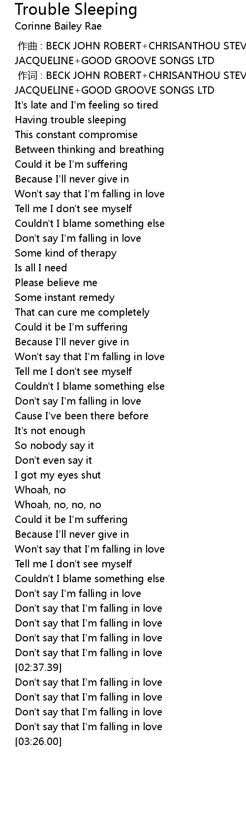 | [00:07.32] | It' s late and I' m feeling so tired |