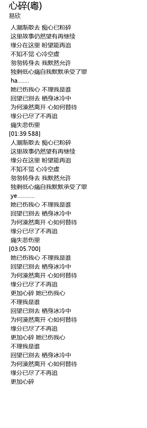 | [03:35.839] | 更加心碎 她已伤我心 |