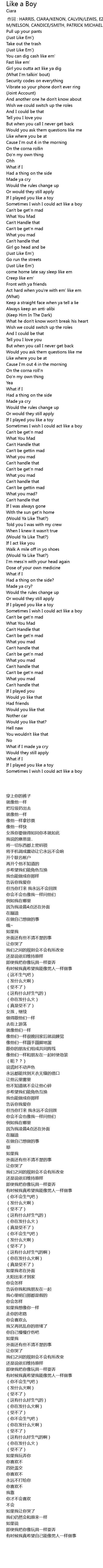 | [00:00.00] | 作词 : HARRIS, CIARA/KENON, CALVIN/LEWIS, EZEKIEL/MUHAMMAD, BALEWA M/NELSON, CANDICE/SMITH, PATRICK MICHAEL |