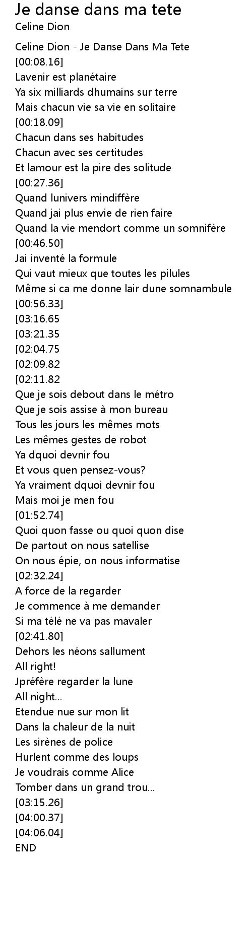 | [00:00.00] | Celine Dion Je Danse Dans Ma Tete |