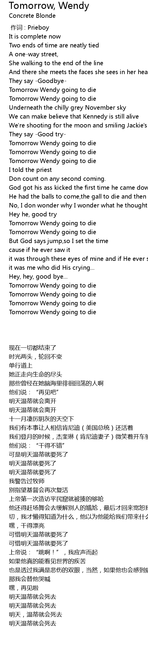 | [01:05.020] | Tomorrow Wendy going to die |