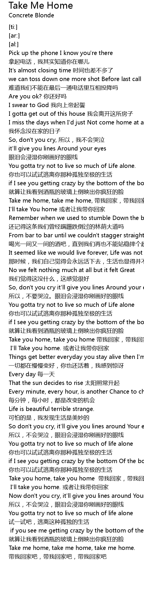 | [04:01.15] | Take me home, take me home, take me home. 带我回家吧,带我回家吧,带我回家吧 |