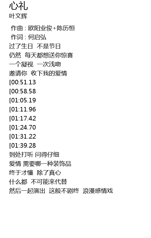 | [02:28.90][00:51.13] | 心礼 一个眼神 几句问候 就能传递 |