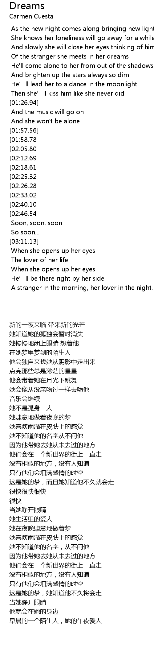 | [05:00.28][02:46.54] | It' s her dream, and she knows he' ll be gone soon |