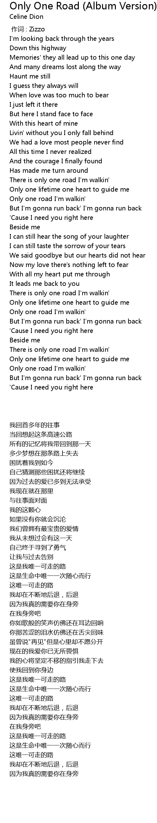 | [02:59.610] | Only one road I' m walkin' |