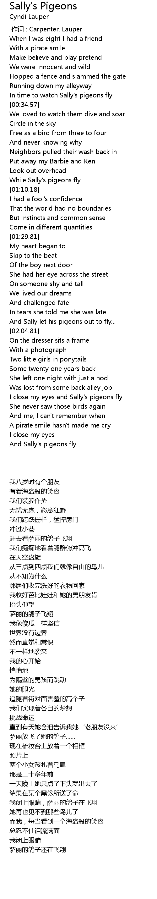 | [01:56.11] | And Sally let his pigeons out to fly... |