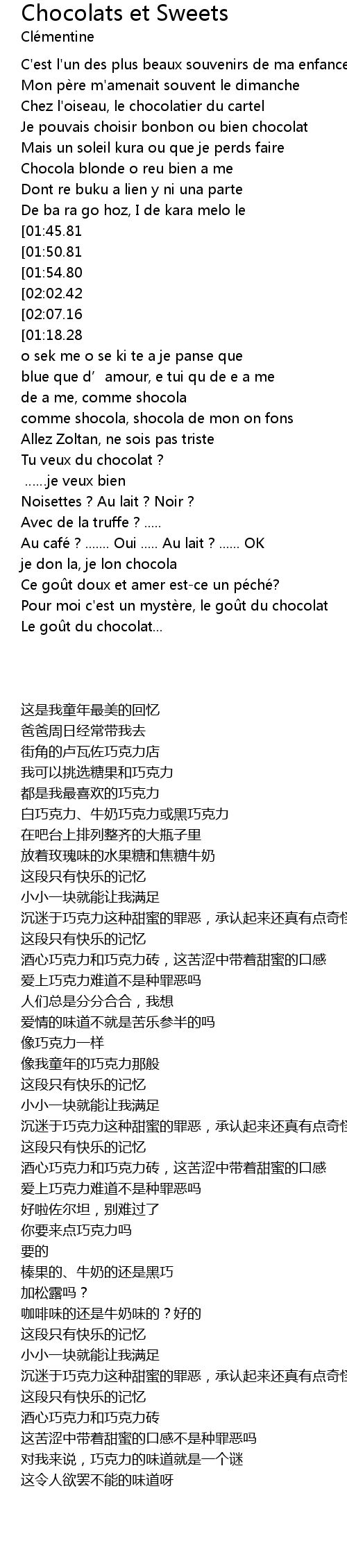 | [01:11.0][02:07.16] | je don la, je lon chocola, se que du e a me |