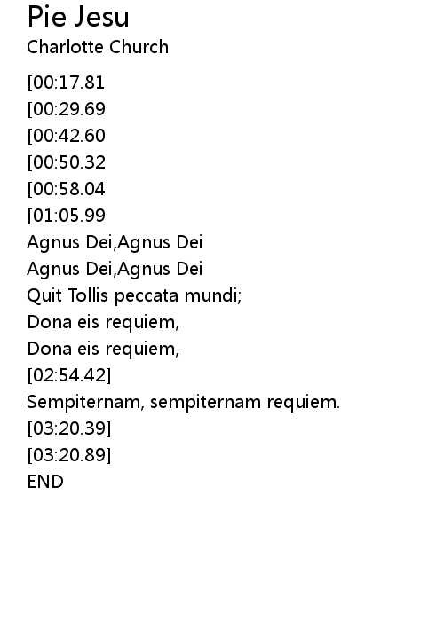 | [01:18.20][00:29.69] | Pie Jesu, Pie Jesu, |