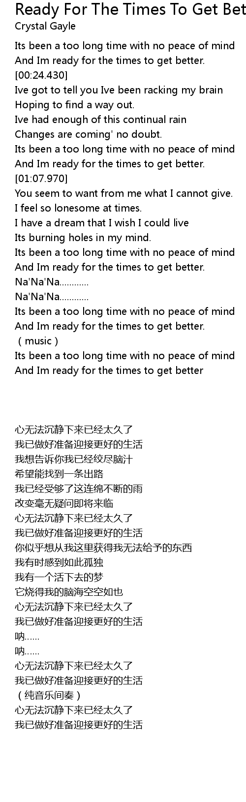 | [00:01.760] | Its been a too long time with no peace of mind |