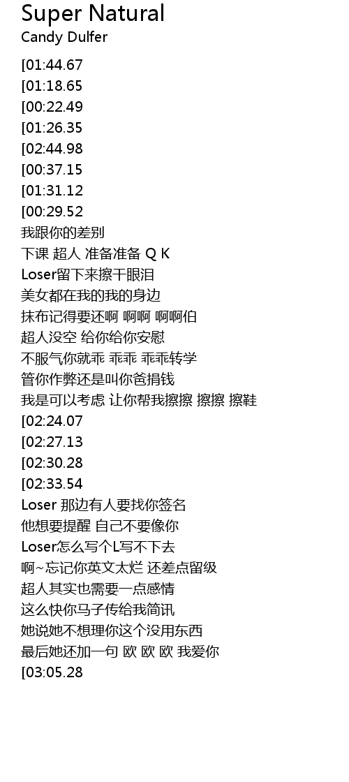 | [02:43.24][02:44.98][02:46.60][02:56.66][02:58.16][02:59.60] | year~我是superman |
