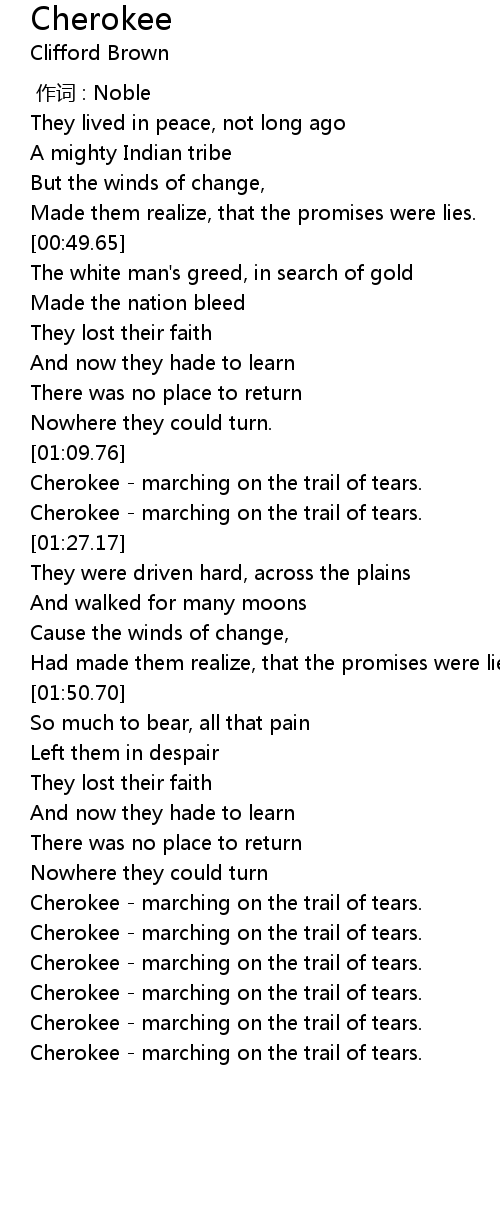 | [02:11.67] | Cherokee - marching on the trail of tears. |