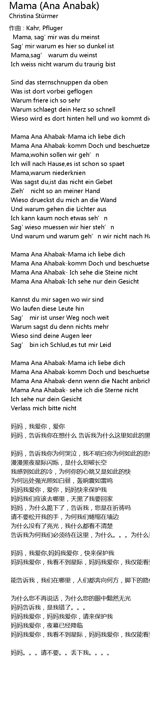 | mā mā, wǒ ài nǐ, mā mā wǒ ài nǐ, kuài lái bǎo hù wǒ | |