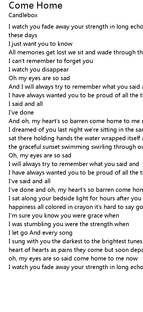 I sung with you the darkest to the brightest tunes will keep you in my heart heart of hearts as pains they come but soon depart and oh, my eyes are so sad oh, my eyes are so said come home to me now |