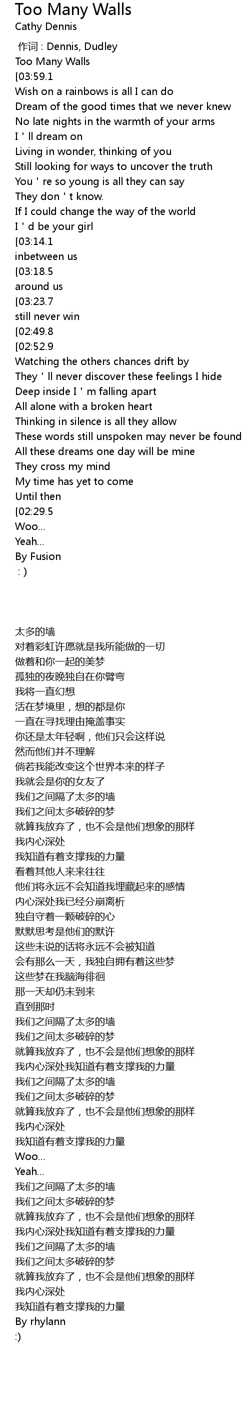 | [03:34.7][03:14.1][02:35.3][02:15.5][01:01.8] | Too many walls have been built inbetween us |