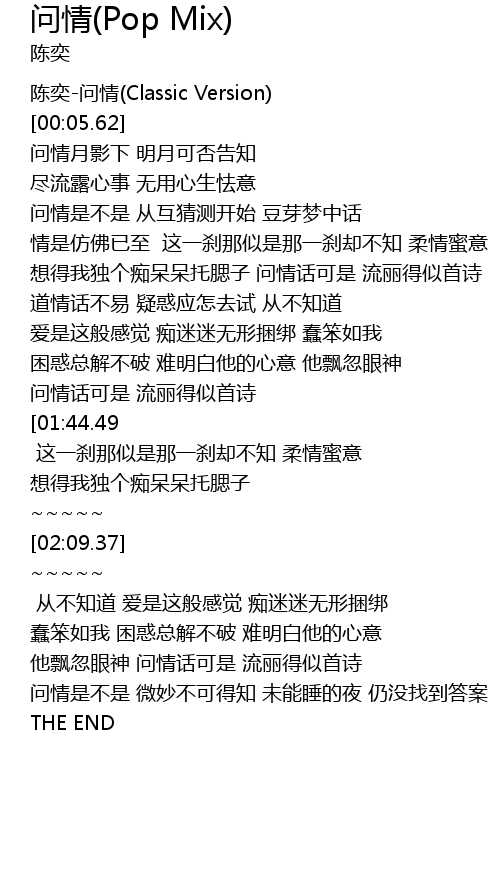 | [00:00.00] | 陈奕-问情(Classic Version) |