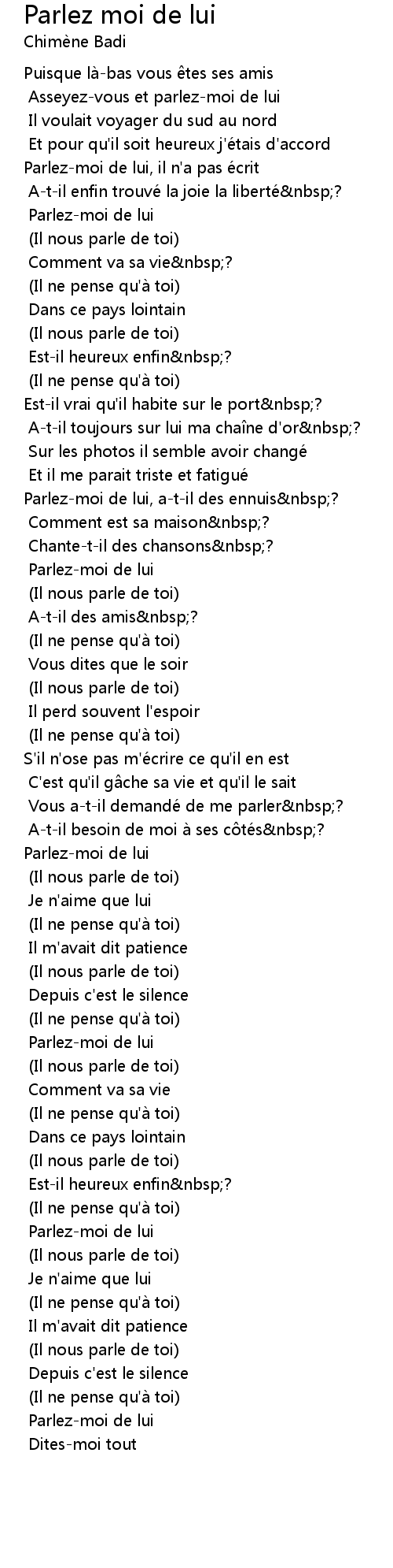 | Parlezmoi de lui, il n' a pas é crit | |
