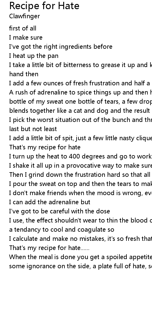 When the meal is done you get a spoiled appetite and a dish full of disagree some ignorance on the side, a plate full of hate, served with a fistful of me |