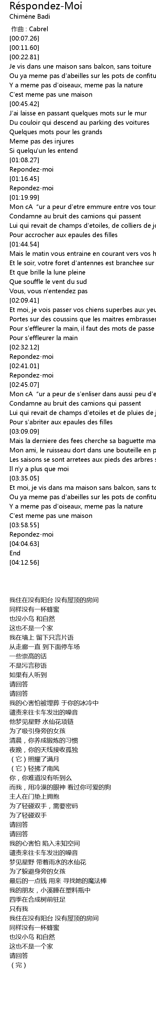 | [03:36.40] | Et moi, je vis dans ma maison sans balcon, sans toiture |
