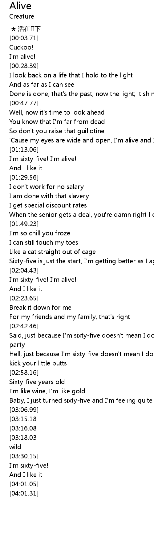 | [02:04.70] | I' m sixtyfive! I' m alive! |