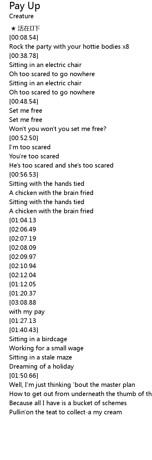 | [03:16.90][03:08.88][02:29.97][01:20.59][03:24.02] | I need a holiday, I need it with my pay |