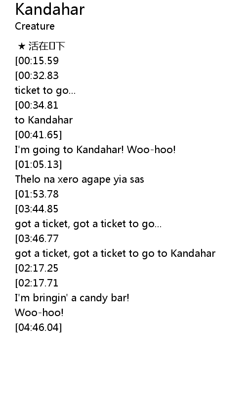| [03:50.81][03:46.77][03:42.90][03:38.84][02:14.71][02:10.85][02:06.85][02:02.82] | Ticket, got a ticket, got a ticket to go to Kandahar |