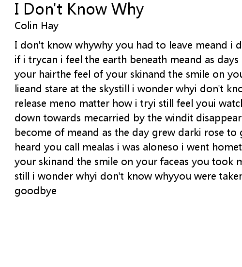 I don't know whywhy you had to leave meand i don't know whyyou said goodbyeonly if i trycan i feel the earth beneath meand as days go byi come alivethe fall of your hairthe feel of your skinand the smile on your faceas you took me innow i lieand stare at the skystill i wonder whyi don't know whyyou said that you'd release meno matter how i tryi still feel youi watched a falling leafdrifting down towards mecarried by the windit disappearedi sat in disbeliefat what had become of meand as the day grew darki rose to goand as i walked alongi thought i heard you call mealas i was aloneso i went homethe fall of your hairthe feel of your skinand the smile on your faceas you took me innow i lieno longer crybut still i wonder whyi don't know whyyou were taken from mei cannot forgetor say goodbye |