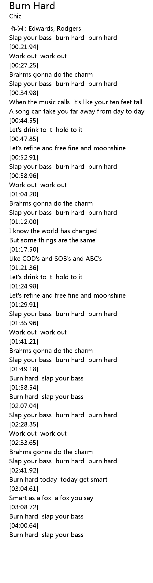 | [04:02.14] | Burn hard slap your bass |