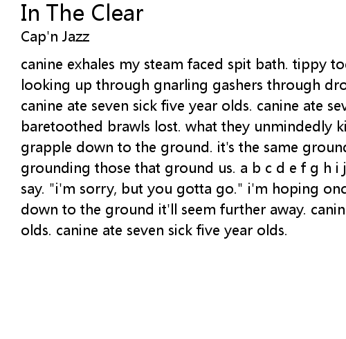 canine exhales my steam faced spit bath. tippy toed. noses nippy cold touch. i'm looking up through gnarling gashers through drooley jowls peering into my peer. canine ate seven sick five year olds. canine ate seven sick five year olds. baretoothed brawls lost. what they unmindedly kick. we shrug and barely bearhug. grapple down to the ground. it's the same ground grounding us. the same ground grounding those that ground us. a b c d e f g h i j k lost. time to move on they say. "i'm sorry, but you gotta go." i'm hoping once i'm a big kid and i look down to the ground it'll seem further away. canine ate seven sick five year olds. canine ate seven sick five year olds. |