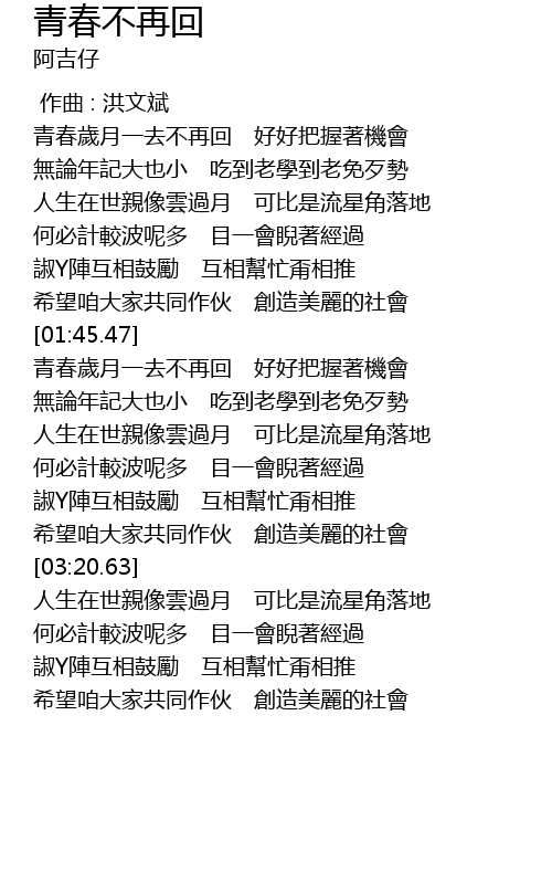 | [02:09.42] | 青春歲月一去不再回 好好把握著機會 |