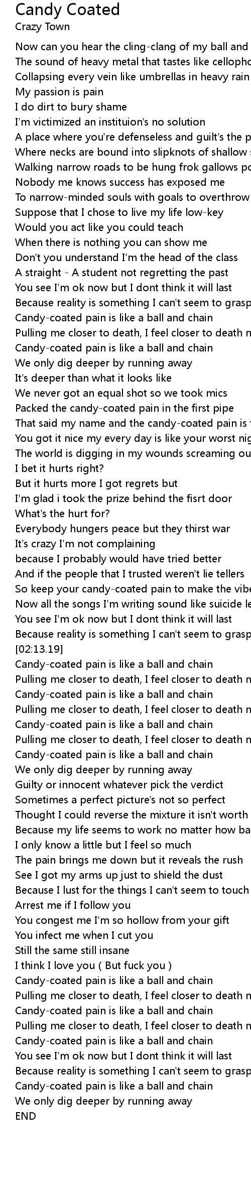 | [02:35.32] | Candy-coated pain is like a ball and chain |