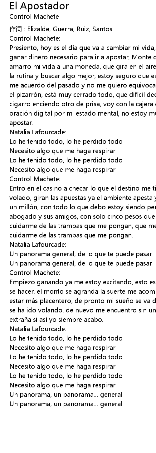 | Presiento, hoy es el dí a que va a cambiar mi vida, y necesito jalar para poder ganar dinero necesario para ir a apostar, Monte de Piedad, casa voy a empe ar, amarro mi vida a una moneda, que gira en el aire para ser situació n, salir de la rutina y buscar algo mejor, estoy seguro que este dí a yo voy a ganar, má s me acuerdo del pasado y no me quiero equivocar, de frente a los datos que indica el pizarró n, está muy cerrado todo, que difí cil decisió n, té rmino mi cigarro enciendo otro de prisa, voy con la cajera que me ofrece una sonrisa, oració n digital por mi estado mental, no estoy muy seguro pero yo voy a apostar. | |