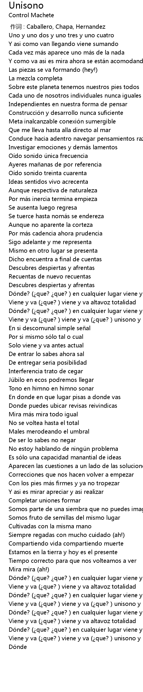| [03:57.38] | Viene y va (¿que? ) viene y va (¿que? ) unisono y unidad |