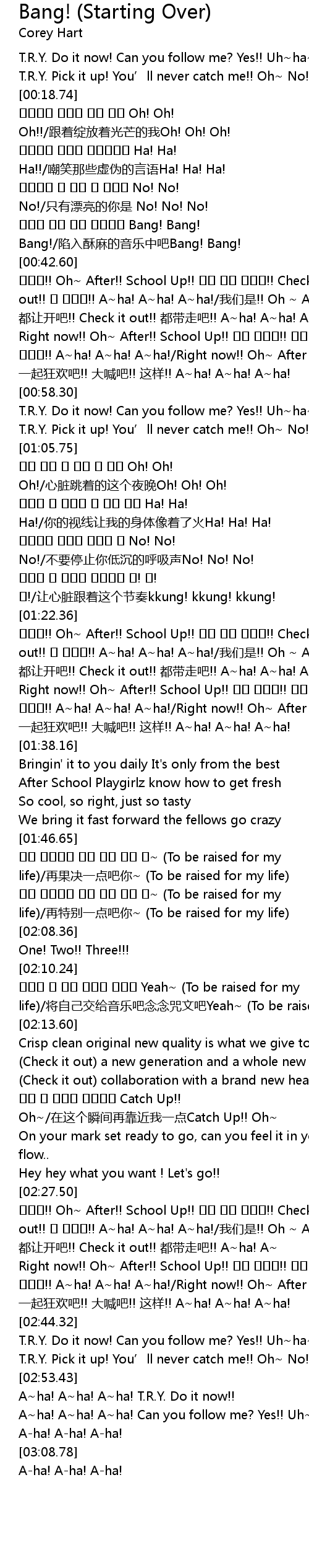 | [02:36.77] | Right now!! Oh~ After!! School Up!! 모두 미쳐라!! 외쳐라!! 또 이렇게!! A~ha! A~ha! A~ha!/Right now!! Oh~ After !! School Up!! 一起狂欢吧!! 大喊吧!! 这样!! A~ha! A~ha! A~ha! |