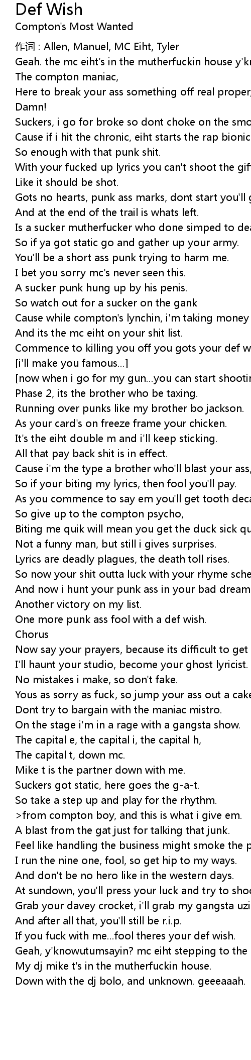 | 作词 : Allen, Manuel, MC Eiht, Tyler | |
