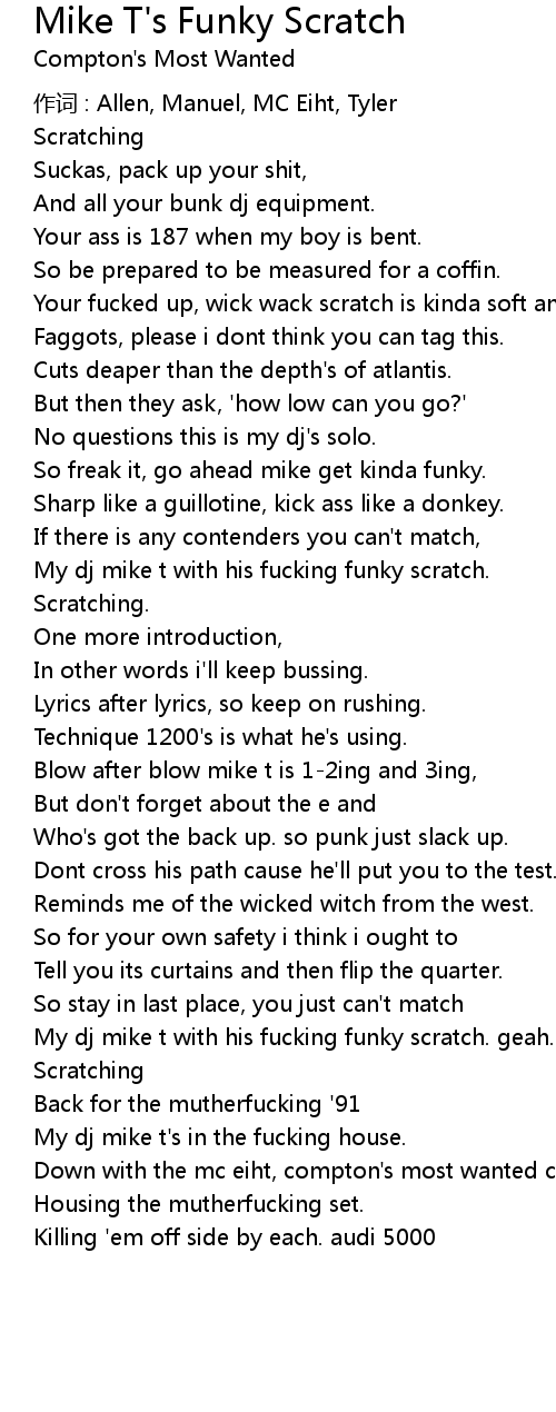 | 作词 : Allen, Manuel, MC Eiht, Tyler | |