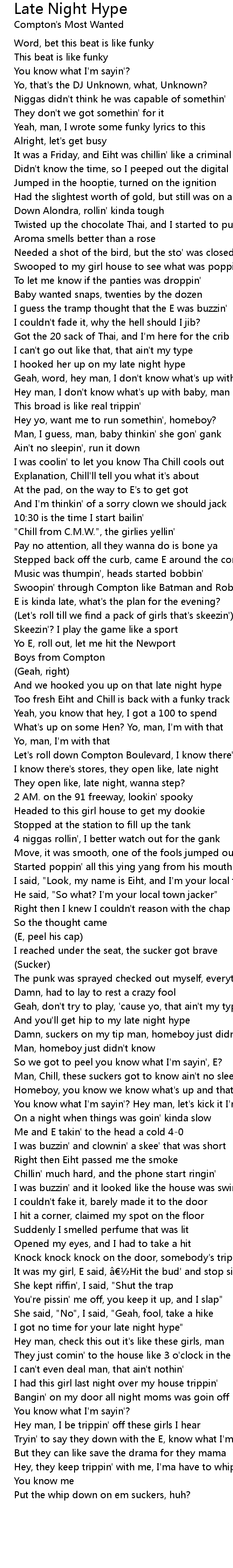 | [03:12.86] | And you'll get hip to my late night hype |