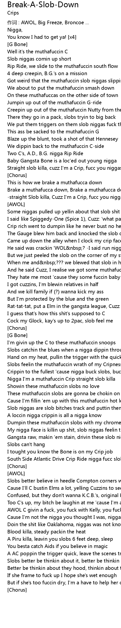 | Crippin to the fullest ' cause nigga buck slobs, buck all slobs | |