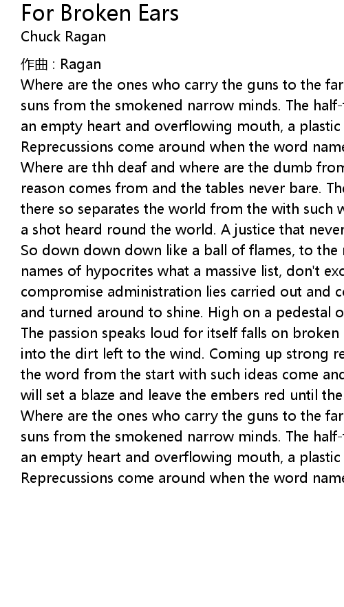 | Where are thh deaf and where are the dumb from the side of the tracks where no reason comes from and the tables never bare. The water runs and momma's always there so separates the world from the with such words and such words would cause a shot heard round the world. A justice that never hurt at all. | |