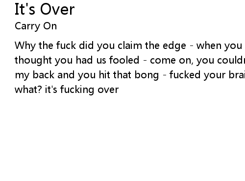 | Why the fuck did you claim the edge - when you couldn't hang in the end - thought you had us fooled - come on, you couldn't have been more wrong - i turn my back and you hit that bong - fucked your brain - try to blame it on me - what? it's fucking over |