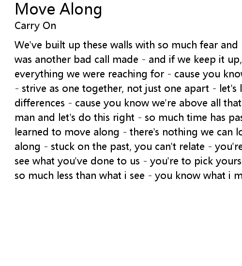 We've built up these walls with so much fear and hate - and every brick we laid was another bad call made - and if we keep it up, we just might - lost everything we were reaching for - cause you know we could make this so much more - strive as one together, not just one apart - let's lay to rest these differences - cause you know we're above all that shit - just put aside our egos man and let's do this right - so much time has passed but you still haven't learned to move along - there's nothing we can lose so why don't you just move along - stuck on the past, you can't relate - you're bringing me down, can't you see what you've done to us - you're to pick yourself up man - you're making this so much less than what i see - you know what i mean |