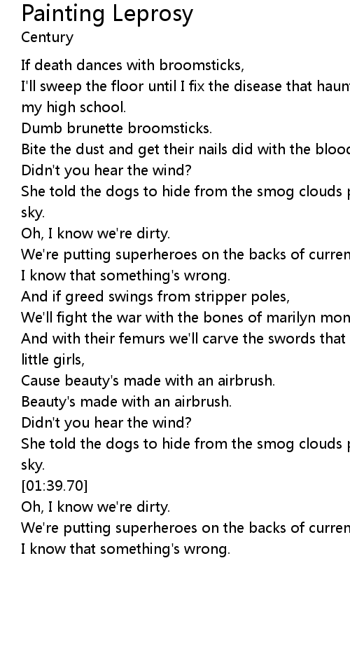 | [01:32.45] | She told the dogs to hide from the smog clouds painting the leprosy sky. |