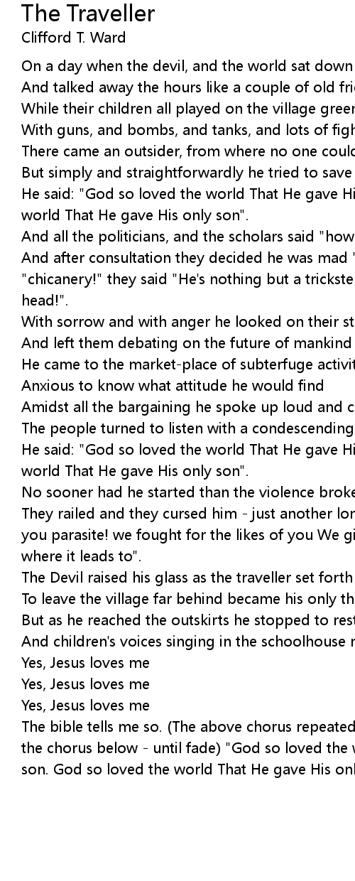 The bible tells me so. (The above chorus repeated, and sung simultaneously with the chorus below - until fade) "God so loved the world That He gave His only son. God so loved the world That He gave His only son". |