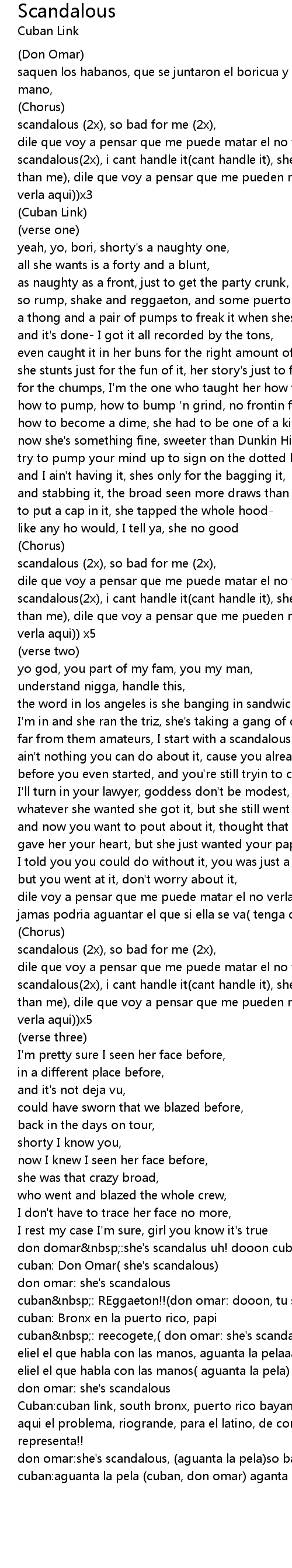 scandalous(2x), i cant handle it(cant handle it), shes more than me(shes more than me), dile que voy a pensar que me pueden matar en no verla aqui (el no verla aqui))x3 |