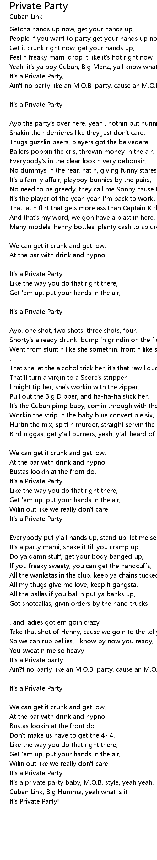 Ain?t no party like an M.O.B. party, cause an M.O.B. party don't stop, don't stop |