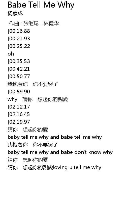 | [01:54.17][00:50.77] | baby tell me why and babe tell me why wǒ bào zhe nǐ nǐ bú yào kū le |
