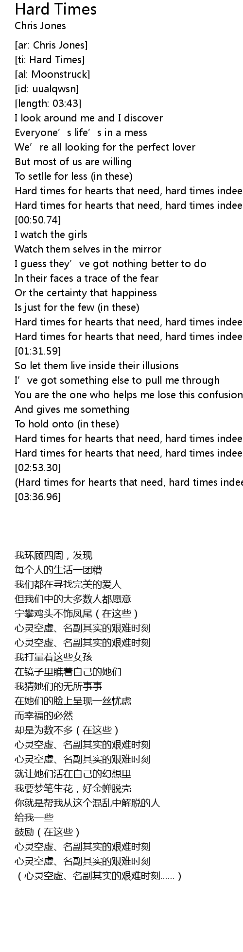 | [00:41.99] | Hard times for hearts that need, hard times indeed |
